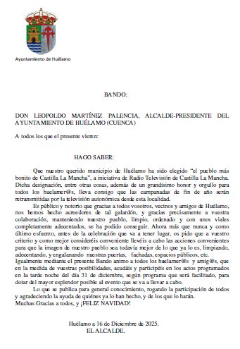 El ayuntamiento de Huélamo emite el siguiente bando municipal para conocimiento de toda la población, para la celebración navideña del título honorífico de «El pueblo más bonito de Castilla La Mancha».