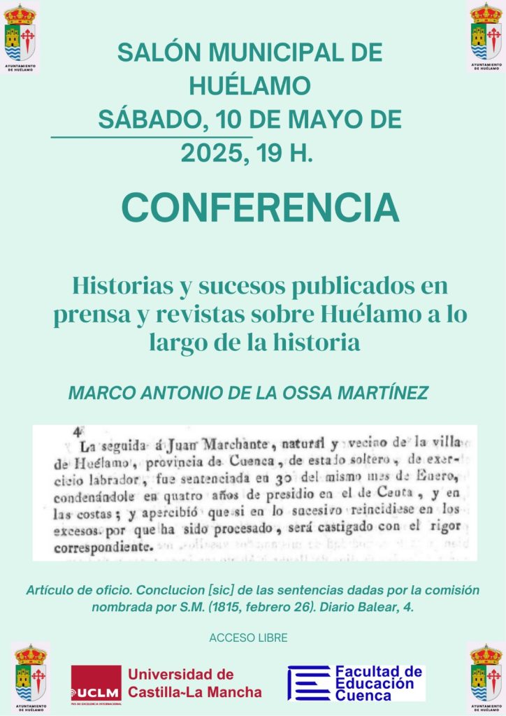 Por la tarde, en la misma ubicación, Marco Antonio de la Ossa nos ofrecerá una conferencia gratuita sobre su investigación acerca de “Historias y sucesos publicados en periódicos, revistas y libros sobre Huélamo a lo largo de la historia”, recogiendo las referencias a nuestra localidad plasmadas en muy diversas publicaciones, haciendo referencia a personajes y acontecimientos que pasaron en nuestro pueblo.