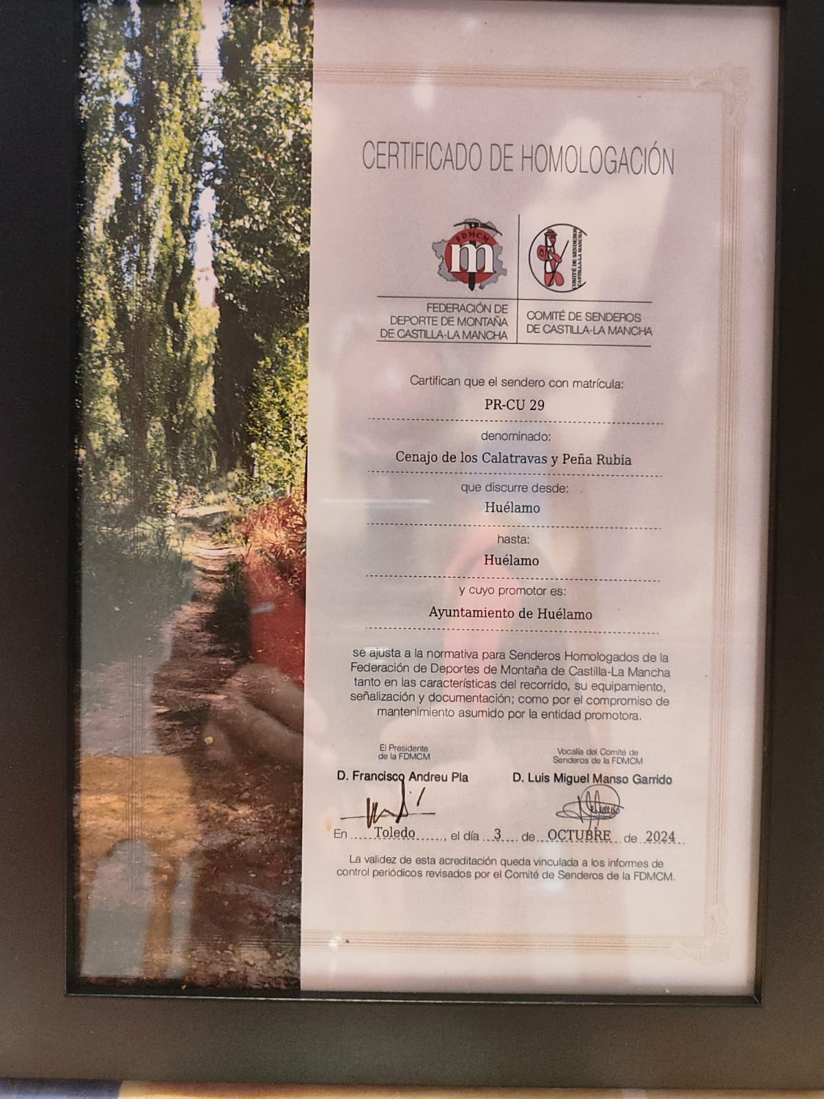Como broche final, se entregó al Ayuntamiento el Certificado de Homologación del sendero, un reconocimiento al esfuerzo compartido entre la Federación de Deportes de Montaña de Castilla-La Mancha, la Asociación de Senderismo de Huélamo y el propio Ayuntamiento.