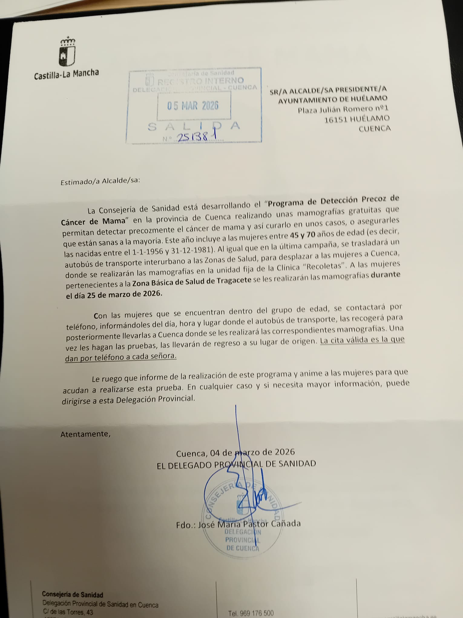 Las pruebas a las mujeres de Huélamo se realizarán el 25 de marzo de 2026 en la Clínica Recoletas de Cuenca, como en años anteriores. Se facilitará transporte en autobús hasta la clínica.